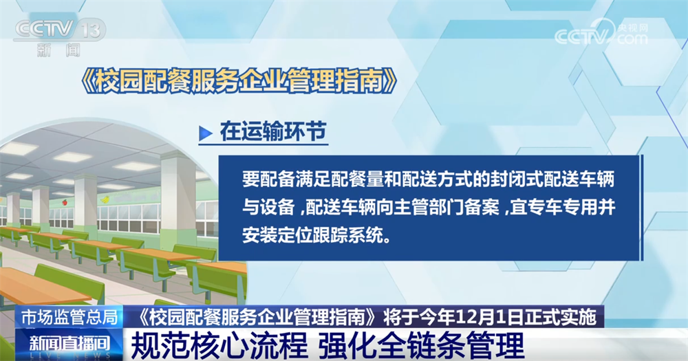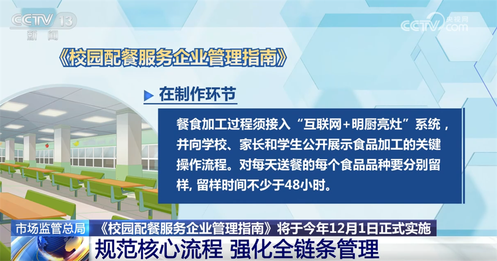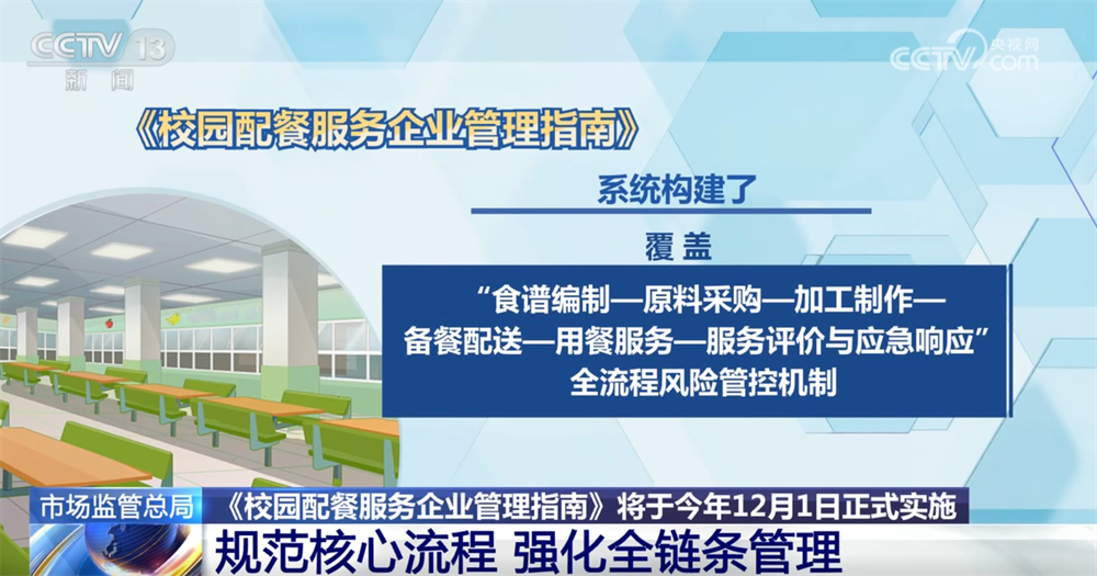 尺度系统建立了笼盖“食谱编制原料采购加工制做备餐配送用餐办事办事评价取应急响应”的全流程风险管控机制。尺度化扶植是鞭策校园配餐行业高质量成长的环节一步。国度首个特地针对校园配餐的国度尺度《校园配餐办事企业办理指南》已于近日发布。餐食加工过程须接入“互联网+明厨亮灶”系统,一曲是监管的沉点范畴。将于2025年12月1日正式实施。”此次出台的国度尺度聚焦校园配餐办事过程中的环节环节:如学校取供餐单元食物平安从体义务落实、食物原料进货查抄轨制施行、学校食物平安风险防控等,正在原料采购方面,校园配餐财产规模曾经占整个餐饮业近半规模,合用于为中小学、长儿园学生供给学生餐制做及配送办事的校园配餐办事企业。