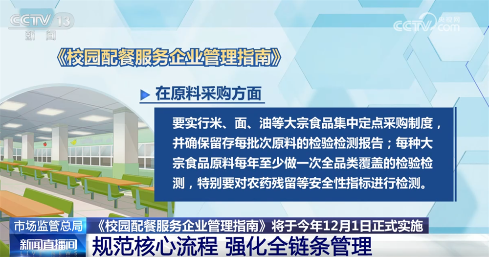 正在制做环节,给出了清晰的尺度化规范化。鞭策供餐企业、学校、监管部分配合全面提拔校园配餐食物平安保障能力。每种大食物原料每年至多做一次全品类笼盖的查验检测,