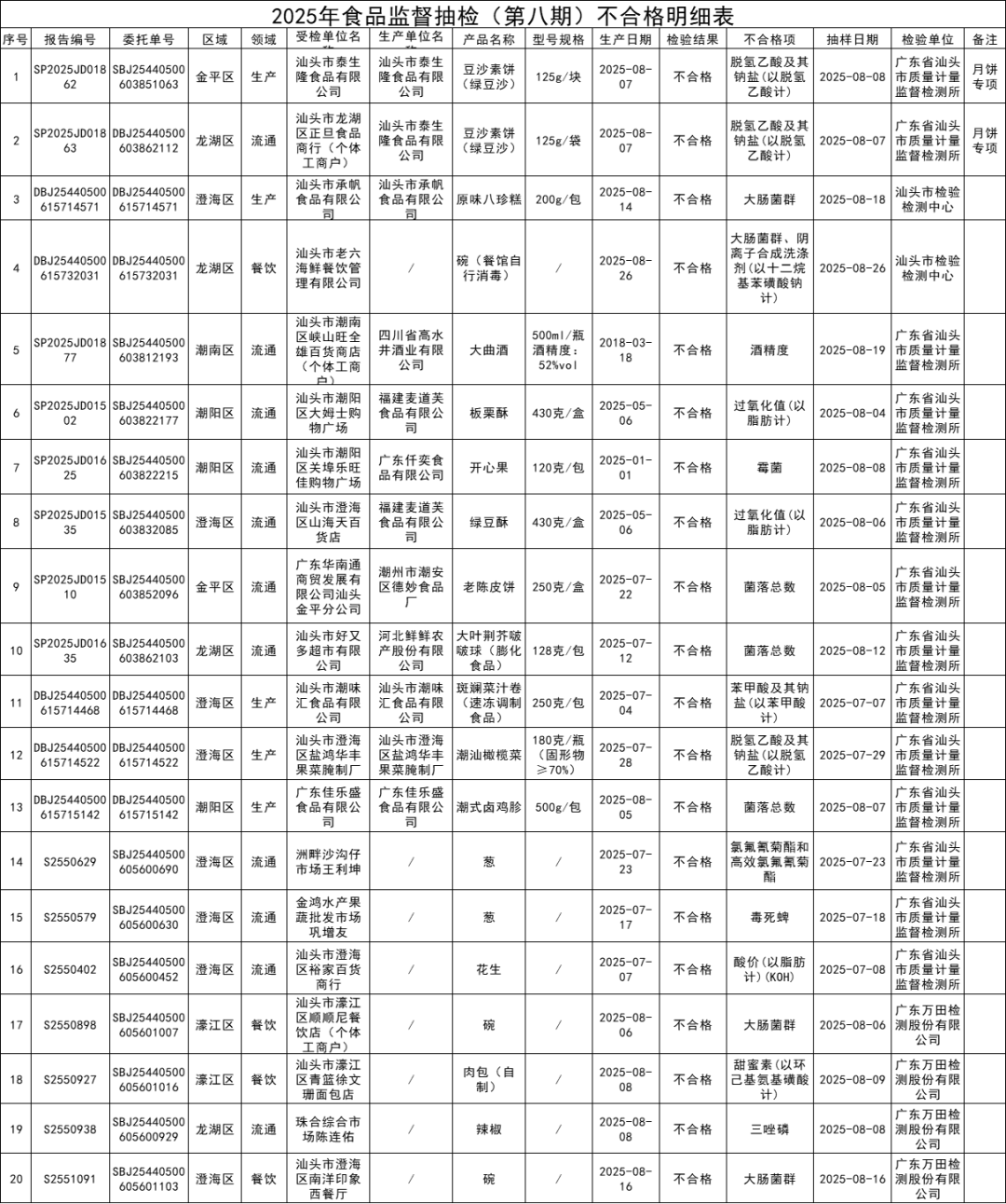 本次抽检不及格项目来自汕头市泰生隆食物无限公司、汕头市承帆食物无限公司、汕头市潮味汇食物无限公司、广东佳乐盛食物无限公司、汕头市澄海区南洋印象西餐厅等多个受检单元。市场监管部分已对抽检不及格食物依法实行下架、召回等防控办法,并对出产、运营不及格食物单元依法进行查询拜访、处置。查看更多该局对全市辖区内的食物企业出产、畅通、餐饮等环节进行食物平安监视抽样查验,